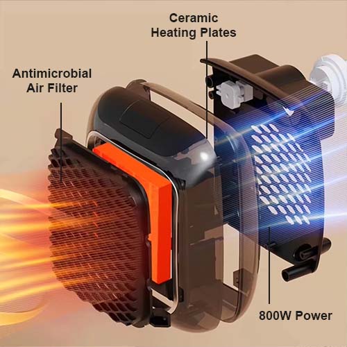 Despite its compact size, EcoWarm quickly warms rooms up to 130 sq. ft., perfect for bedrooms, offices, and more. Its portable design makes it easy to move, while the built-in antimicrobial filter purifies the air as it heats - ideal for allergy sufferers. For safety, EcoWarm has an automatic cool-down mode to prevent overheating and extend its lifespan.